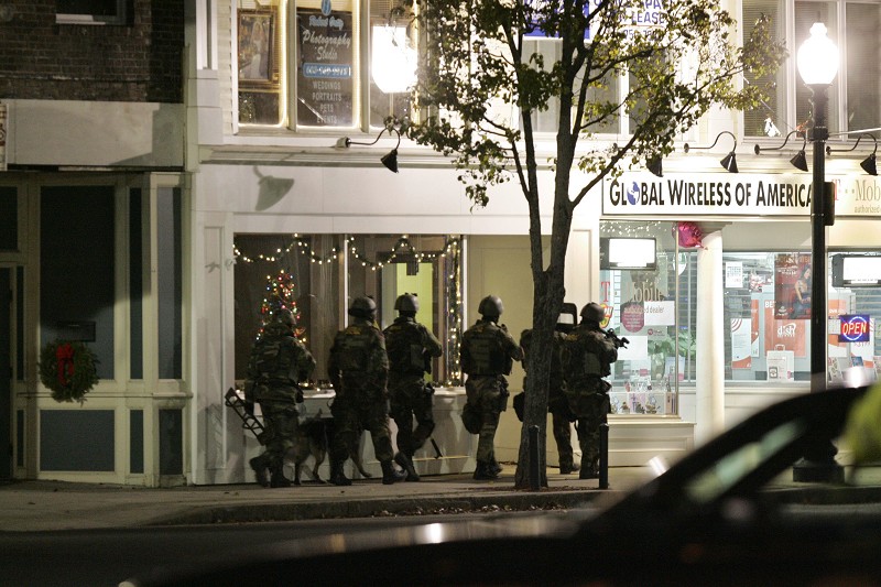 图为警察在人质劫持现场外搜寻。