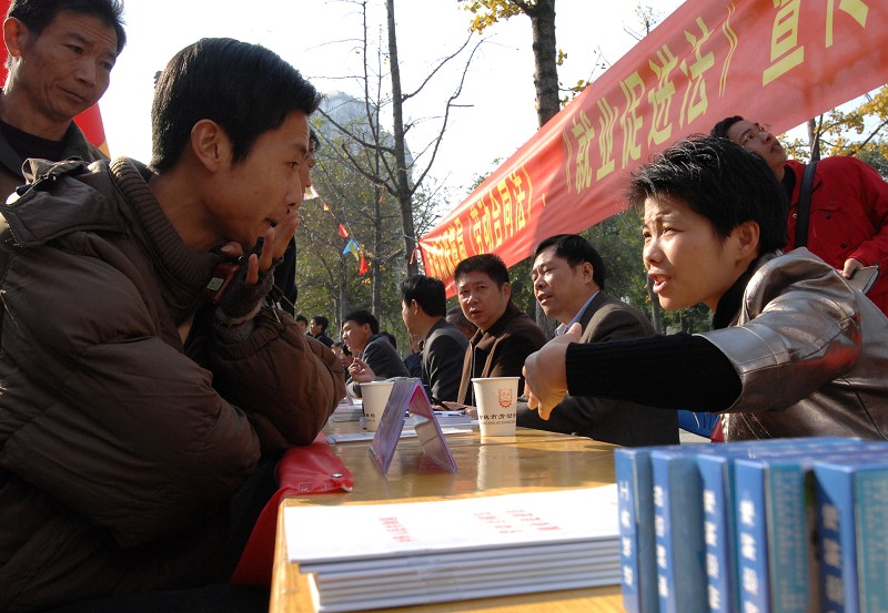 12月2日,余姚市劳动部门工作人员(右)在受理一名男青年的咨询。当天是浙江省余姚市规定的“外来务工人员日”,为了配合即将颁布的新《劳动合同法》宣传,余姚市工会及劳动和社会保障部门的法律专家走上街头,义务为外来务工人员宣传新法,并提供咨询服务。 (新华社发)