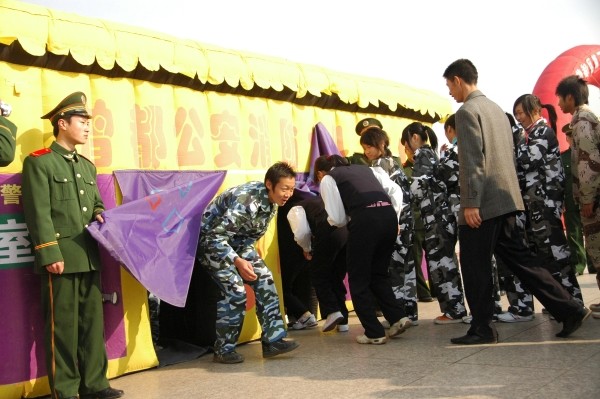 武警随州市消防支队曾都中队引进气垫模拟火场逃生帐篷,对市高级技工学校