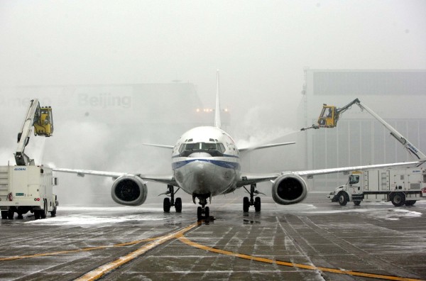 12月10日,北京降下今冬第一场雪,图为首都机场工作人员为飞机除雪。 (新华社发)