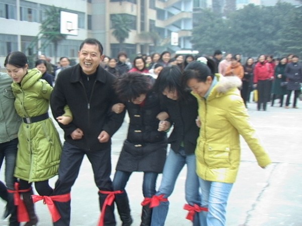 精彩的比赛和热烈的场面吸引了众多师生驻足观看。图为老师们正在进行“步调一致”的比赛。(王尚荣熊伟摄)