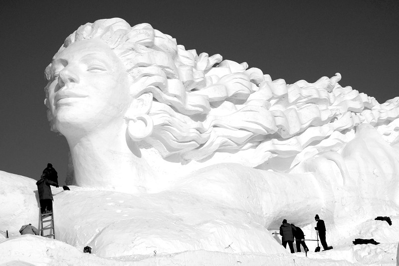 12月18日,工人们在对雪雕艺术博览会主雕塑《浪漫风情》进行局部修整。将于20日开幕的黑龙江省哈尔滨市第二十届太阳岛国际雪雕艺术博览会目前进入倒计时阶段,工人们加快了各雪雕作品的制作进度。据了解,本届雪博会总面积45万平方米,总用雪量约12万立方米、用冰量1万立方米。 (新华社发)