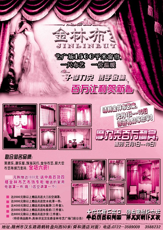 ■达2000元除以上赠品另送大三匹空调罩■达3000元除以上赠品另送饮水机罩一件■达4000元除以上赠品另送电脑罩(三件套)■达5000元除以上赠品另送电视机罩(三件套)■达6000元除以上赠品另送沙发罩(三件套)(特价商品除外,具体详见汉东路金林布艺广场门前公告)