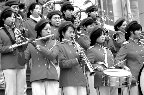 昨日,神农大剧院门前,着装整齐的女子仪仗队列队两旁,欢迎参加政协会议的委员。