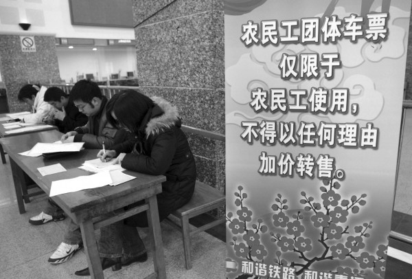 1月5日,企业代表在上海站办理农民工团体火车票。为保障春运期间农民工平安顺利返乡,上海铁路部门当天启动了农民工团体火车票预订工作。 新华社发