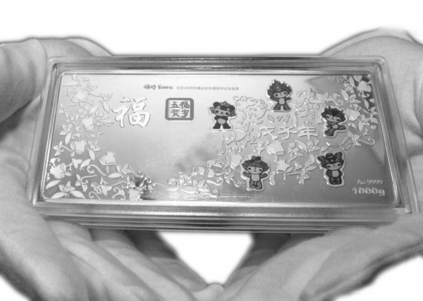 2008年1月2日拍摄的奥运会五福贺岁纪念金条。北京2008年奥运会五福贺岁金条、银条将于1月8日在北京上市销售。“五福贺岁金、银条”由北京奥组委授权、中国印钞造币总公司制造发行。“五福贺岁金条”规格分别为50克、100克、500克和1000克四种;“五福贺岁银条”规格分别为50克、100克和1000克三种。