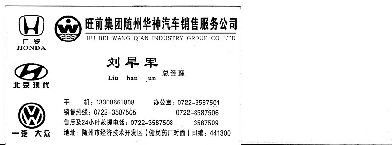 旺前集团随州华神汽车销售服务公司成立于2006年3月,注册资金1000万元。公司主要经营广汽本田、北京现代、一汽大众等各大汽车品牌的整车销售、汽车维修、配件销售等。