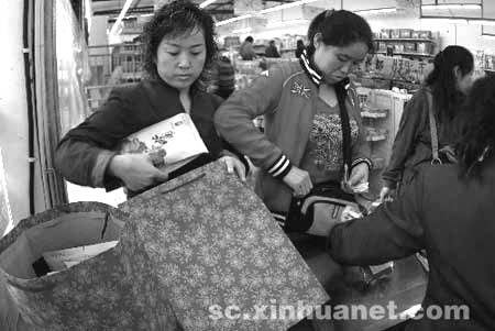 在成都一家超市,收银员用纸袋为顾客装购买的商品。