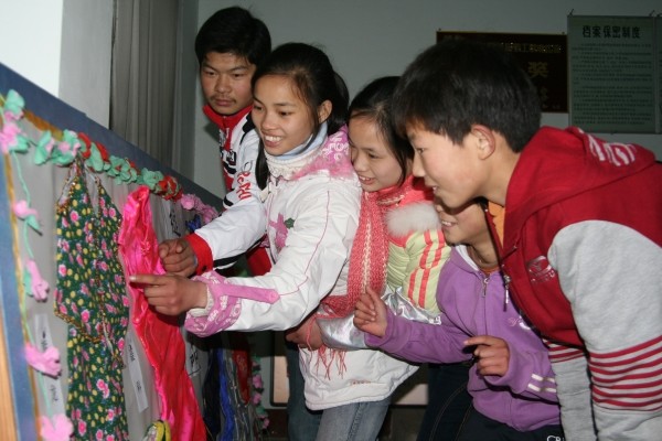 曾都区特殊学校积极培养学生的动手能力,让他们在学校能学到裁缝、烹饪、剪纸、绘画等一技之长。图为学生们在学校里欣赏学姐的作品。 (徐军国/摄 吴如冰/文)