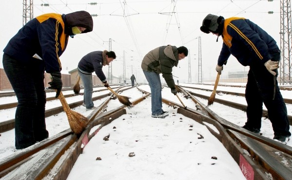 1月20日,兰州铁路局银川工务段工人在清理道岔积雪。春运期间,为应对连日的降雪天气,兰州铁路局银川工务段设立24小时专人值守岗位,每天巡线数十次,清理道岔积雪,维护线路,保证铁路安全与畅通。 (新华社发)