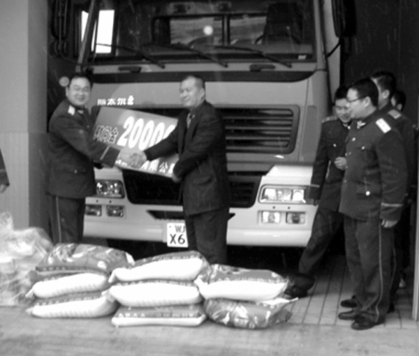 昨日下午,湖北裕国菇业公司董事长、总经理雷于国冒着大雪为曾都区消防大