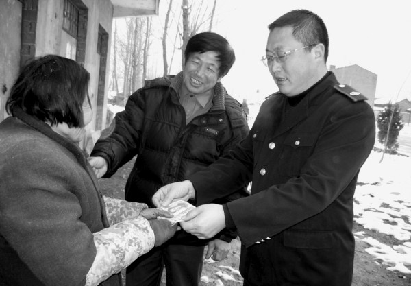 图二:曾都区地税八分局坚持多年支持驻点村洪山镇周家湾村发展生产、扶贫济困。近三年来共帮扶资金10万余元。图为近日分局局长付卫民踏雪来到该村为特困户送去慰问金2000元。金 鸣/摄黄业勇/文