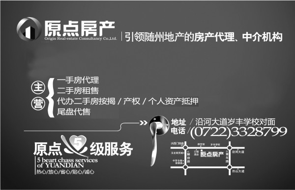 原点房产成立于2006年,全面引进沿海成熟专业的房产中介服务模式,以随州为立足点以专业精干革命的地产代理形象向周边城市辐射发展。是随州唯一一家有房地产管理局颁发资质的代理公司。公司秉承“细节服务全过程”的企业理念,提升服务标志,致力于为客户提供二手房、商铺的买卖、租赁全过程细节服务。公司以诚信经营,五心服务(热心、放心、省心、贴心、诚心)为宗旨开展房产交易业务资询;房产代理;二手房租售;代办二手房按揭、产权过户;个人资产抵押;尾盘代理等业务。