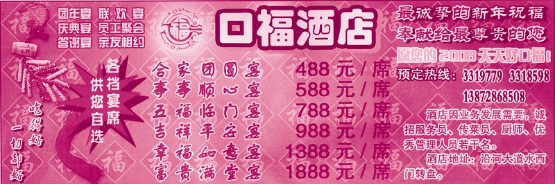 坐落在随城白云湖边口福酒店始创于1992年,它的前身是口福城,现在的口福酒店是2004年4月18日开业的。目前拥有2000余平米的营业面积,30余间包房,一楼三楼两个宴会大厅,可同时容纳一千人就餐。酒店主营新派鄂菜、湘菜、粤菜及海鲜等,不论您是高档商务宴请还是家庭聚会,您都能体验到物超所值的享受。宴会大厅设有多功能宴会厅,可为您提供专业音响设备、专业会场布置、专业司仪和礼宾服务。
