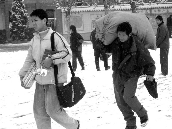 近日,我市各学校陆续放寒假,又恰遇连日降雪的隆冬天气,学生家长们纷纷到学校接孩子回家。图为一个学生家长,肩扛着孩子行李,跟孩子一起回家。