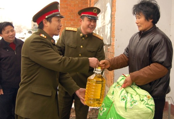 1月23日,曾都区人武部官兵冒着严寒,分别来到曾都区环潭镇万家河村贫困户家中慰问,并为每户送去棉衣、棉被、大米、食用油及200元慰问金。