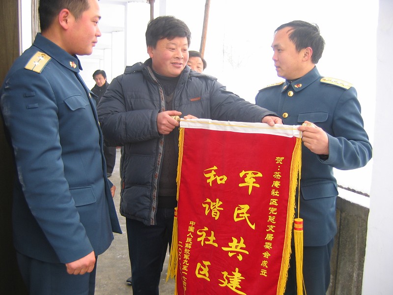 曾都区南郊办事处茶庵社区,是去年我市成立的首家农村社区。社区成立后,驻随某部雷达通讯连与该社区开展“共建”活动,经常组织官兵到社区扶贫济困,参与社区抗洪抢险,开展文化娱乐等活动,使社区精神文明建设呈现新景象。图为近日社区党总支成立,通讯连向该社区赠送共建旌旗。 (陈 杰摄)
