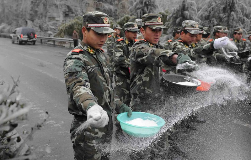1月25日,受50多年未遇的凝冻天气影响,贵阳再度遭受冻雨袭击,造成贵阳机场关闭,130多个航班延误;多条高速公路关闭,数千辆载重货车滞留国道。图为在通往贵阳机场的高速公路上,武警战士正在撒盐抗灾。 (新华社发)