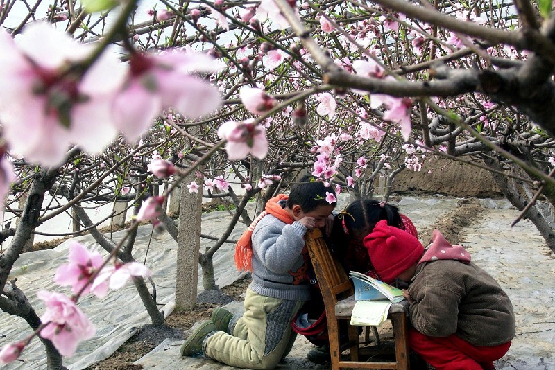 1月25日,孩子们在油桃大棚里写作业。山东省沂南县湖头镇陆家哨村油桃大棚内的桃花竞相开放,吸引了众乡亲前来赏花。 (新华社发)