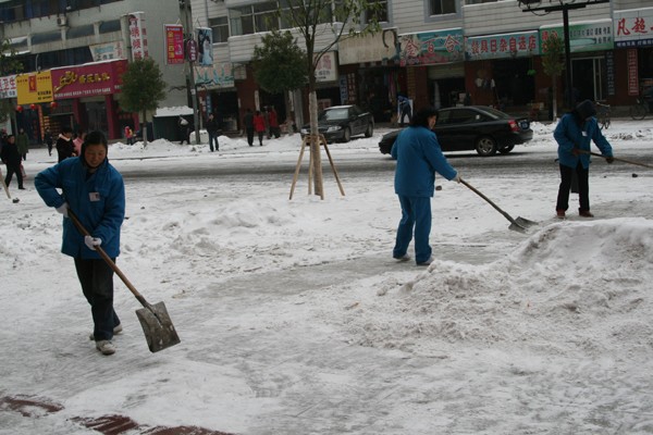昨日,随州城区许多单位清扫门前积雪,保证路面畅通。图为中商百货的员工正在铲雪,方便市民购物。 (徐军国摄)