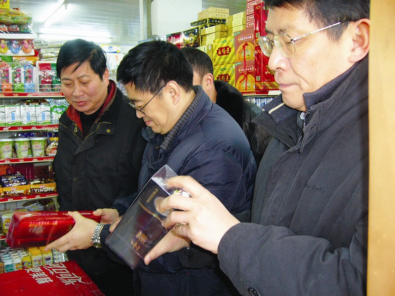 随州市副市长黄志群(中),副秘书长陈建安(左)在广水市副市长李健强的陪同下检查卷烟市场。