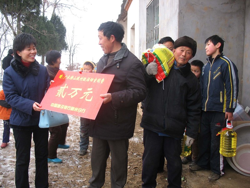昨日,建行随州分行人员冒着严寒来到多年帮扶的贫困点———广水市横山坡村慰问,将米、油、科技书送到贫困户手中,还捐助两万元现金用于村级活动室建设。(见习记者杨闻名通讯员郭昊摄)