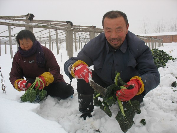 昨日,市经济开发区淅河镇云龙街社区居民罗选明、万家秀夫妇在雪地里扒青菜,老两口高兴地说:“没下大雪时青菜批发价每斤0.6元,下雪天每斤1.8元,全部批发到超市或菜市场。” (见习记者 杨闻名摄)