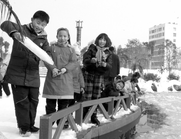多日降雪低温,许多池塘结了厚厚的冰。一些小学生出于好奇心,纷纷到池塘里捞起冰块玩。据了解,许多池塘有一米多深,若孩子因捞冰掉进池塘中,后果不堪设想。建议有关方面有所防范,学生家长要照顾好孩子。