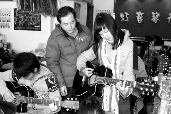 ,在老师的指导下学习吉他演奏。(本报记者张顺摄)