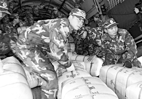 一月三十一日,贵州省武警部队官兵搬运救灾衣被。当日,为支援贵州灾区受灾群众,由民政部和总参谋部紧急救助的首批十二万件(床棉衣、棉被全部运至贵阳,并迅速转运到灾民手中。(新华社发)