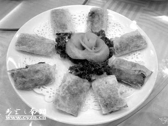 4.原炒锅置旺火上,下芝麻油(耗100克),烧至五成热,将春卷逐个下锅炸至金黄色时,捞出盛盘即成。
