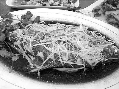 2.铁锅置旺火上,下清水烧沸,将整条鱼连盘上笼蒸,蒸至鱼眼突出,肉已松软,约15分钟左右出笼,拣去姜块、葱结;