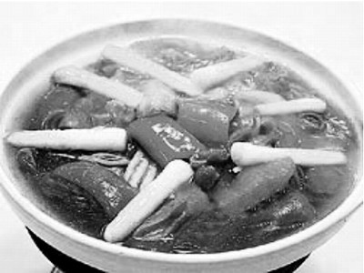 3.炒勺放在火上,加一两猪油,放入葱花、姜末略炸一下,再加入鸡汤,随即把全部料下勺,顺序加入绍酒、盐、糖,烧入味后,再加酱油,然后用少许水淀粉勾芡,再加少许猪油,随即淋入鸡油,出勺装盘即成。