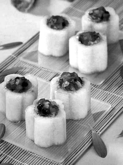 2.下6成热油中煸炒,再加料酒、酱油、白糖、味精、冬菇汤,烧开后勾厚芡,冷后成馅;