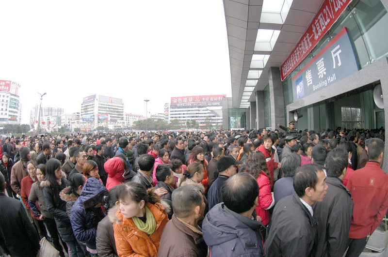 图为12日,四川南充火车站站前广场上站满了排队购票的旅客。