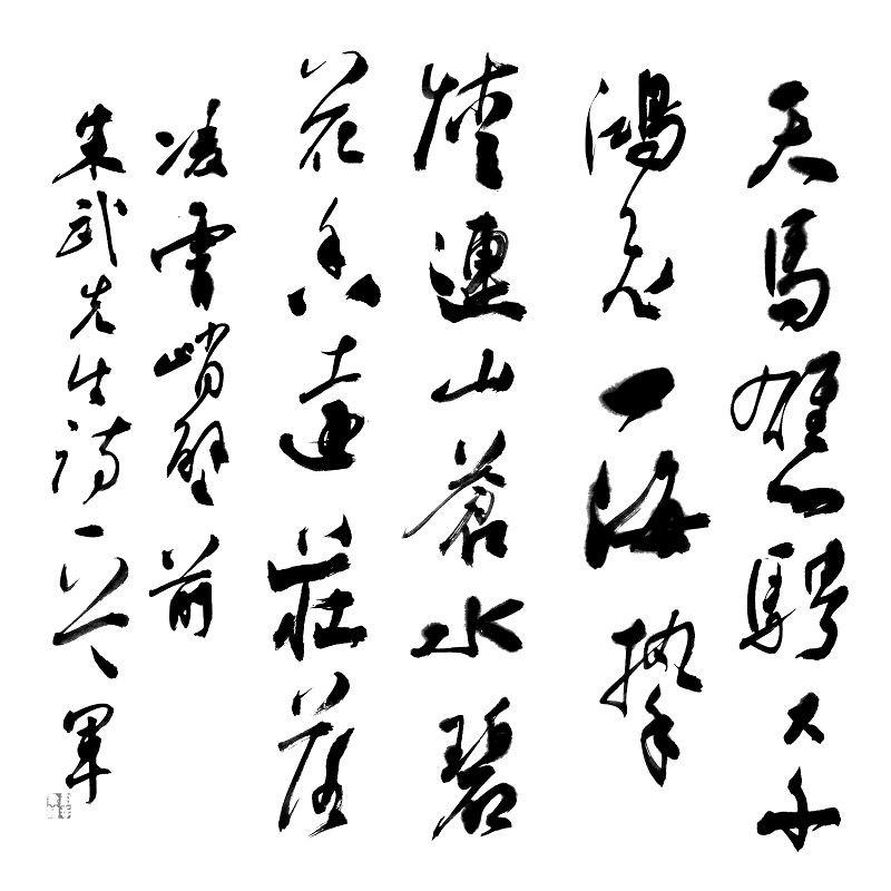天马雄心骋大千,鸿飞一海挚情连。山苍水碧花香远,庄落凌霄峭壁前。