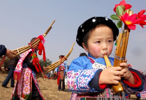 2月15日,一名苗族小朋友在跳花节上吹芦笙。当日,贵州省贵阳市花溪区燕楼乡旧盘井村举行一年一度的跳花节。苗族同胞吹起芦笙、跳起舞蹈,欢度村寨灾后的首个跳花节。 (新华社发)