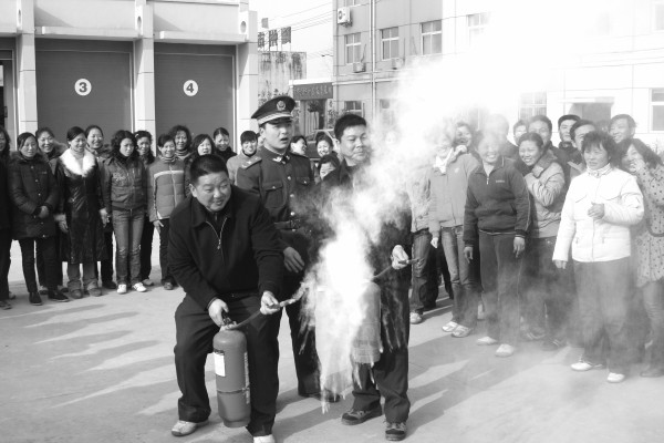新春伊始,湖北天力医药有限公司组织全体员工进行为期3天的军训和消防知识演练,图为曾都消防中队教官教员工进行灭火演练。 (徐军国摄)