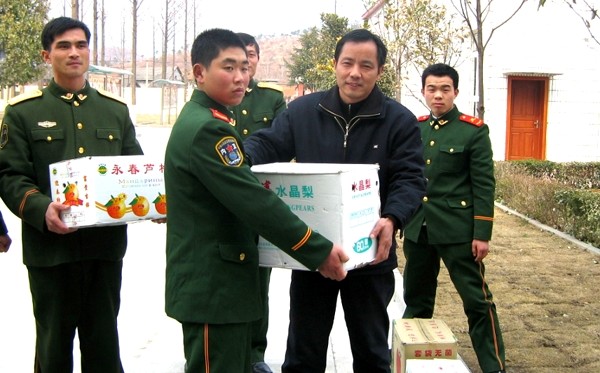 曾都区军粮供应站坚持长年为驻随部队送粮上门,并根据他们的需求做好军粮供应,受到部队官兵的好评。昨日该站员工带着水果驱车来到地处随北的武警某部慰问官兵。 (松 华摄)