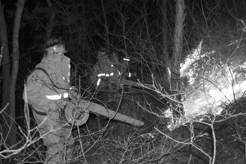 起火的山头位于曾都区吴山水库东,2月18日1时左右,记者在现场看到,老远就有两条火带,站在山脚下可以清晰地看到山上的滚滚浓烟和冲天的火光,浓烟在空中蹿至几米高,树木烧焦的味道在空气中弥漫。低矮的灌木已经完全烧毁,山坡上积了约5厘米厚的灰烬。在山坡背侧,明火还在向山脚下的灌木丛蔓延。森林武警拿着风水灭火机、水枪迅速兵分两路,从东西方向向山顶合围。到达火场后,森林武警顶风开出隔离带,阻断蔓延的山火。