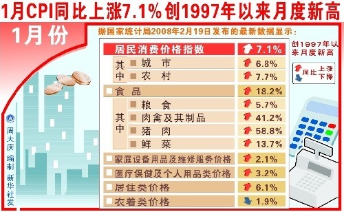 新华社2月19日电 国家统计局19日发布最新统计,受春节和雪灾等因素影响,今年1月份全国居民消费价格总水平(CPI)同比上涨7.1%,创1997年以来月度新高。是自1996年12月CPI上涨7%以来,最近十多年来的月度历史新高。
