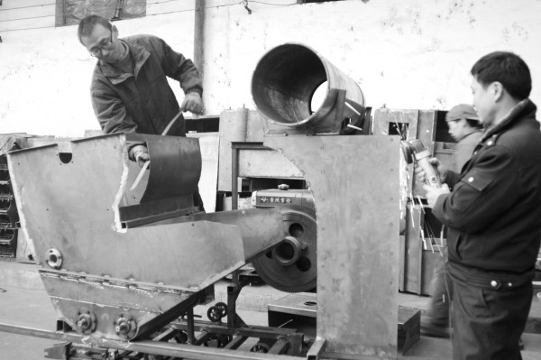 图: 市双利农机制造有限公司生产制造的麦稻联合收割机先后获得国家两项技术专利。今年又被列入国家农机产品目录。图为工人们正在对产品坯样进行技术加工。