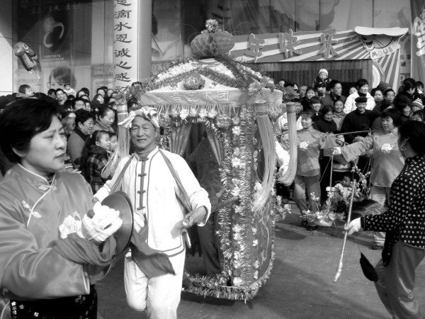昨日是传统的元宵佳节,我市城乡喜气洋洋,以各种方式欢度元宵佳节。图为民间文艺队正在城区表演“花轿迎春”。 (本报记者 唐天才 通讯员 吕鹏翔摄)