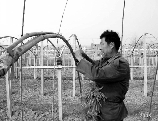 2月18日上午,曾都区万店镇塔湾村一组农民张寿树正在扎蔬菜大棚竹架。他希望通过抢种一茬蔬菜,把雪灾损失补回来。(本报记者 陈晓林摄)