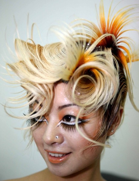 2月26日,中国美发美容协会在北京举行新闻发布会,宣布中国首次组队参加世界最高级别的世界杯发型化妆大赛。由29人组成的中国代表队包括7名参赛选手,他们将于2月27日从北京启程,前往美国芝加哥,参加在那里举行的第32届(2008年)世界杯发型化妆大赛。图为模特展示参赛作品。