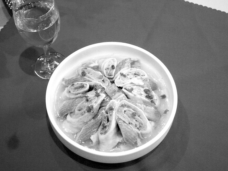 吃过蛋饺的人会知道,蛋香与肉香混合后没有了肉的油腻却多出了蛋的醇香。而这道鸡汁蛋卷,除了切成段的蛋饺,另有鸡汁和蟹柳相伴。且不说淡淡的黄色与鲜艳的红色的组合在色彩上感觉很棒,清朝李渔这样赞美蟹:“已造色、香、味三者之极,更无一物可以上之。”鸡蛋、精瘦肉、蟹肉、鸡汁都是极上等补品,浓浓的鸡汁、具有嚼劲的蟹柳,鲜嫩的蛋皮,剁工细腻的精肉,集鲜香滑嫩、松软爽口的口感于一体。这道营养全备的菜让食者看着舒心,吃着更是放心。
