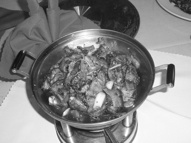 涮骨,干锅居里味道好。满桌的美味佳肴,首先是被巴人片片鱼的香味吸引,走近看,片片鱼躺在干锅里,色泽鲜艳,红黄绿搭配协调,透过花椒便能看到鲜嫩的鱼肉,主要材料就是财鱼和腊肉,配料就是花椒和小米椒,却老远就能闻到腊肉带出的财鱼独有的香味,完全没有鱼的腥味,拿起一片鱼肉放进嘴里,香辣取味,咸鲜增味,鱼肉鲜嫩无比,很有嚼劲,而腊肉也保持了它原先的肉味,两者虽合二为一,味道却保持了各自的特色,令所有品尝过的人记忆犹新。