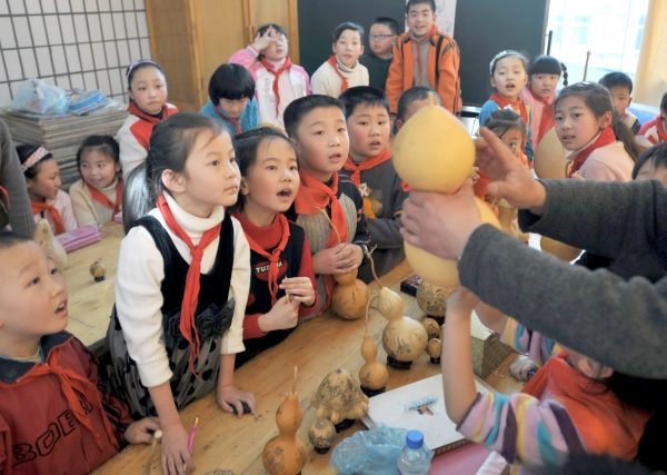 3月11日,兰州市一只船小学的小朋友在老师的指导下欣赏雕刻葫芦。甘肃省兰州市城关区一只船小学在原有教学内容的基础上,将兰州市雕刻葫芦、黄河水车、羊皮筏子等地方特色文化带入课堂,让孩子了解地方文化。(新华社发)
