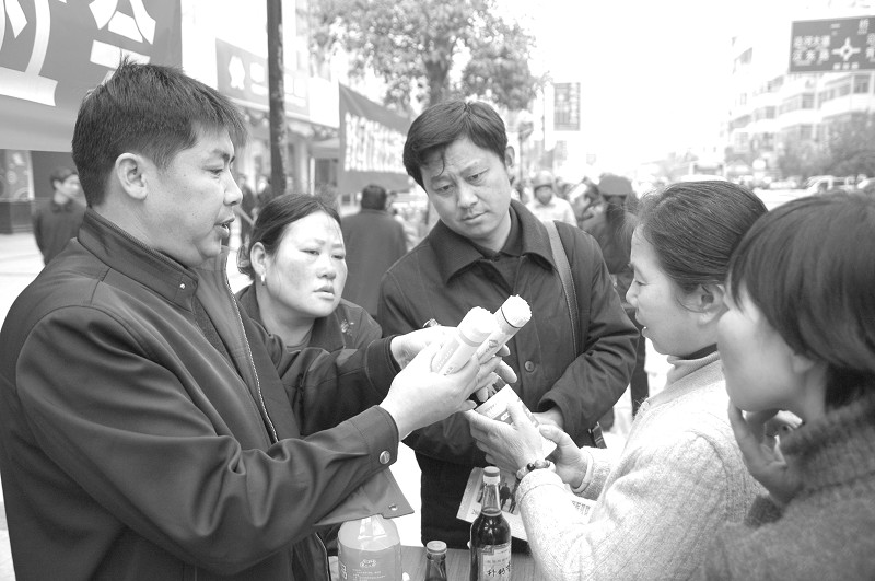 昨日,曾都区工商局、消费者委员会牵头组织食品药品监督、物价、烟草等29个单位,200余人参与3·15消费权益日活动,工作人员拿着实物讲解帮助市民学会辨别假冒伪劣产品。 (本报记者 李文军 通讯员 李 俊摄)