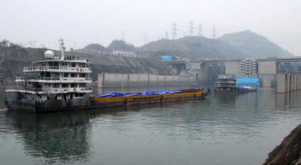 3月17日,两艘货轮开进三峡船闸六闸首北线船闸。长江三峡水利枢纽双线五级船闸在经过近37小时的持续停航后,于17日11时30分恢复双线通航,这是三峡船闸2003年6月建成通航后,因恶劣天气停运时间最长的一次。 (新华社发)